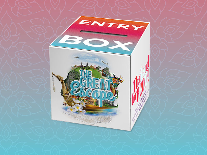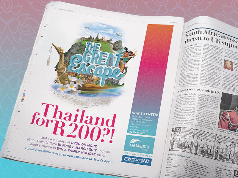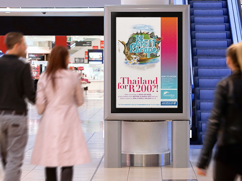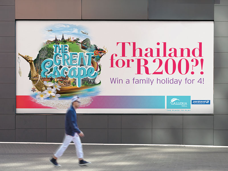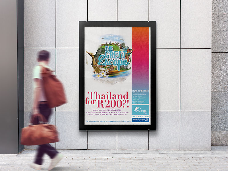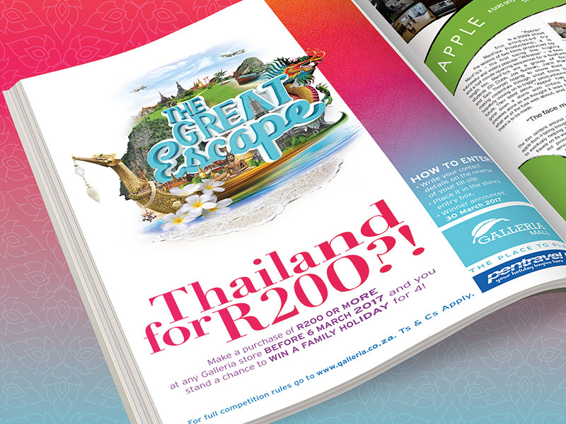Galleria Mall is located on the east coast of South Africa in the tranquil holiday town of Amanzimtoti. This was a new account to pitch a fun and catchy, creative campaign, advertising a competition at the Galleria Mall to win a trip to Thailand for a family of four. To create the ‘feel’ and vibe of Thailand, a logo device was designed using a montage of vibrant Thailand imagery. This creates the idea of excitement, fun and a sense of adventure, ei The Great Escape! This campaign was to run over several mediums online, print and OOH as wel as instore promotions.