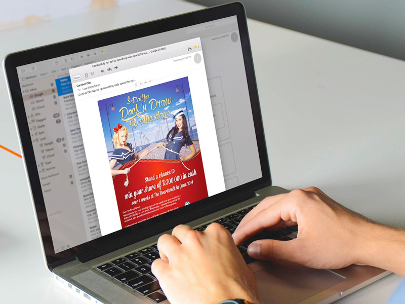 The Boardwalk Casino have a weekly draw on wednedays where customers can win their share of R300 000 in cash. The campaign need a direct mailer that would inform and entice the recipients to visit The Boardwalk, and enter this draw. Our concept - Dock ‘n Draw. An invitation to visit The Boardwalk, stay a while and play. The copy and art-direction approach was nautical themed and consistent with the brand and its visual positioning. It is playfull, exciting and enticing, with two sailorettes pulling you in for a great time.